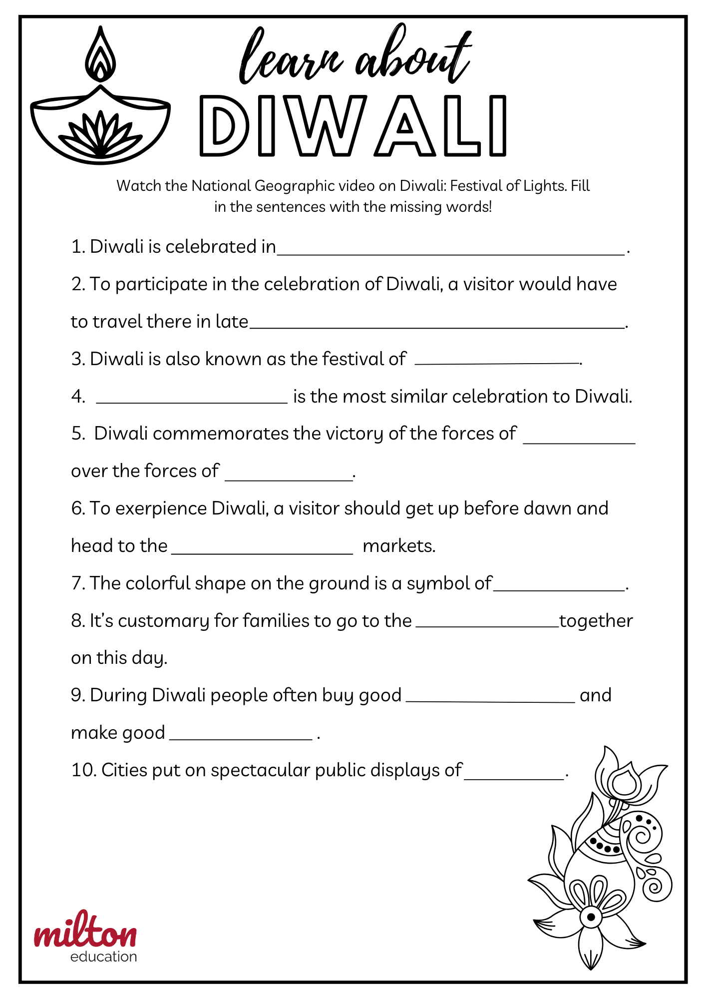 Students watch a video about the festival of Diwali and fill in sentences with the corresponding information. Click here for the video. Suitable for upper-level primary and secondary.
