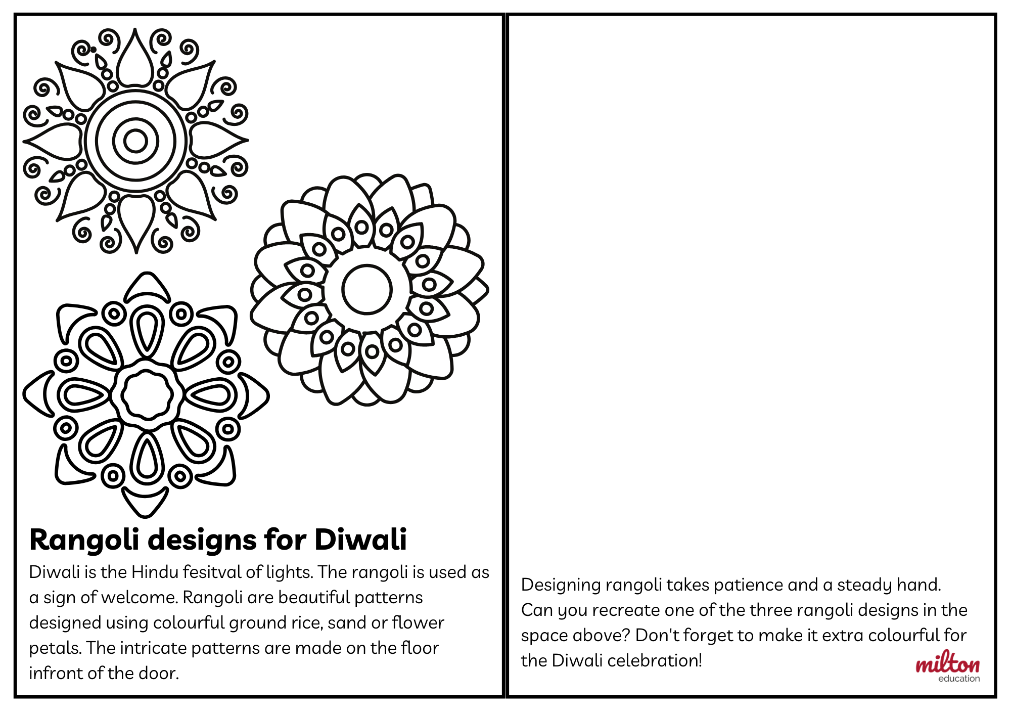 Rangoli are beautiful patterns designed using colourful ground rice, sand or flower petals. Students recreate one of the rangoli designs using whatever material you choose! This activity can be modified for all levels.