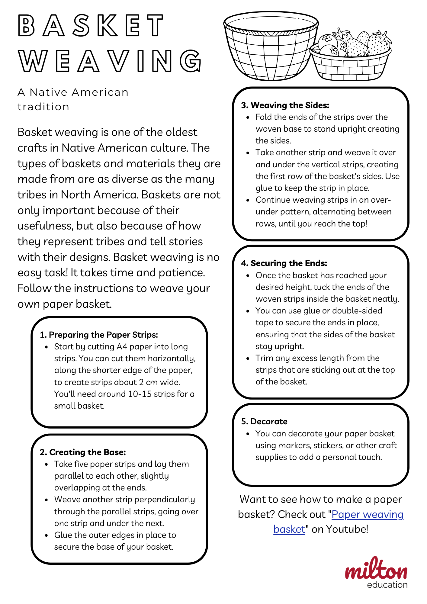 Basket weaving is one of the oldest crafts in Native American culture. This craft can be done along with the presentation and game or on its own. Can be modified for primary or secondary.