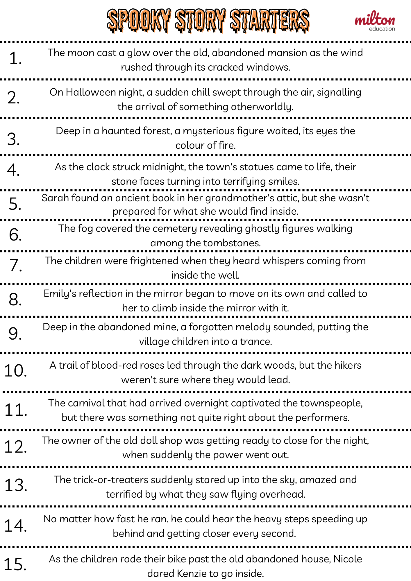 Use these spooky story starters to get your students inspirted to write a terrifying tale. Students choose one as their first sentence and continue writing, creating their own spooky short story. Suitable for secondary.